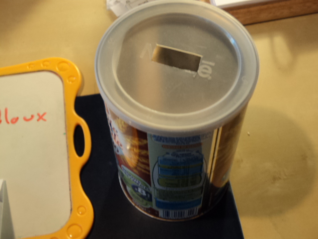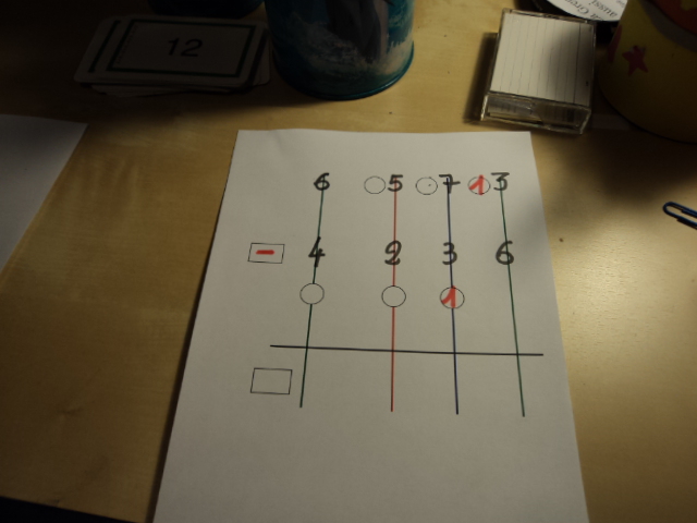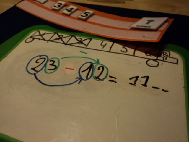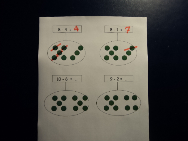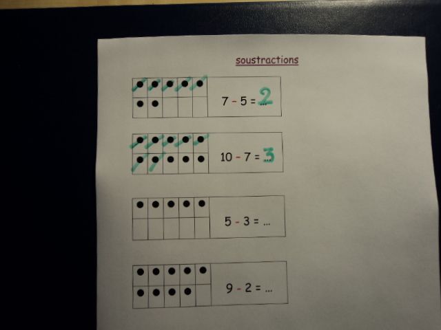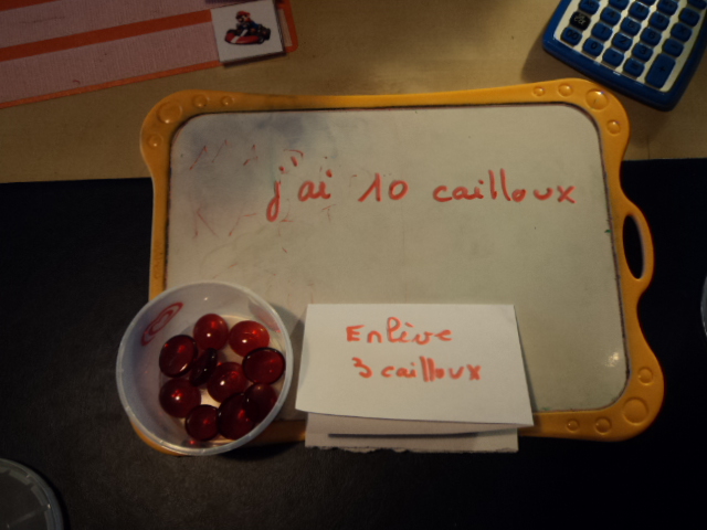 Il avait alors une boîte poubelle avec un couvercle fendu comme pour une tirelire et il déposait le nombre indiqué sur son petit papier. Ensuite, il comptait ce qui lui restait. J’écrivais alors les étapes de sa manipulation (EX : 10 – 5 = 5).