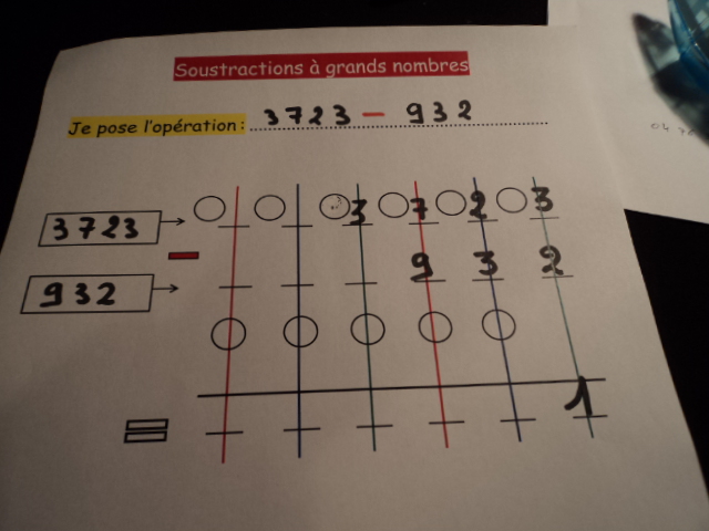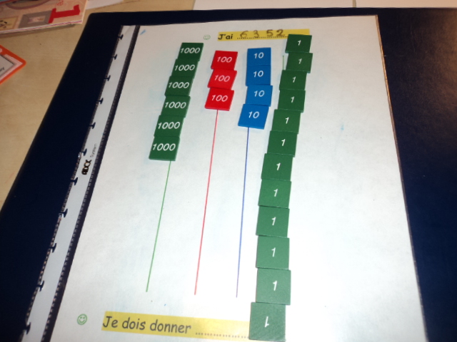 Après quelques jours de formation Montessorienne chez notre psychologue préférée, nous sommes passées aux soustractions de très grands nombres avec les perles et les plateaux.