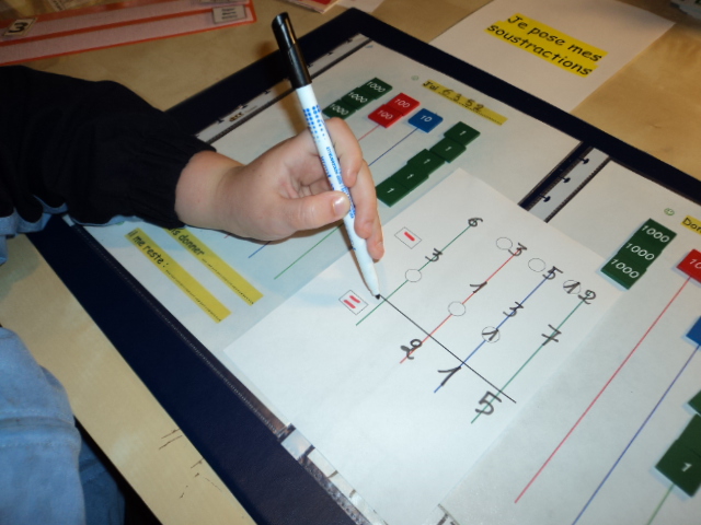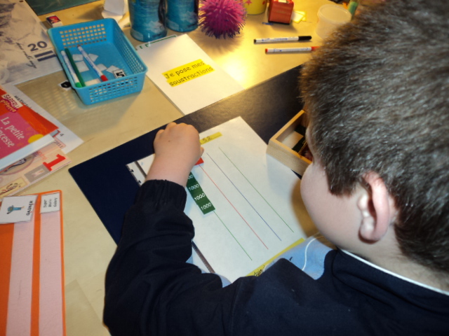 La 4ème série de fiches. Pour la soustraction dynamique, nous avons procédé de la même manière en faisant du change à « la banque ». Nous avons repris la méthode de Martine pour ne pas intégrer d’additions dans une soustraction, mais j’ai remplacé les cadres par les lignes hiérarchiques. (je pose la dizaine en haut et je l’écris sur la ligne hiérarchique suivante en bas pour ne pas oublier de la retirer.)