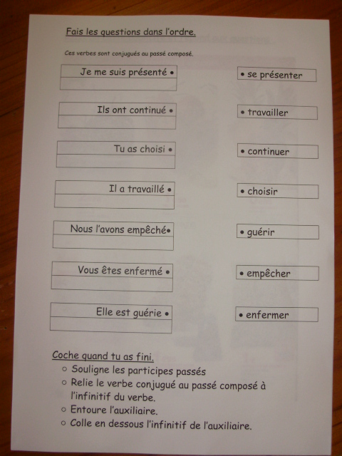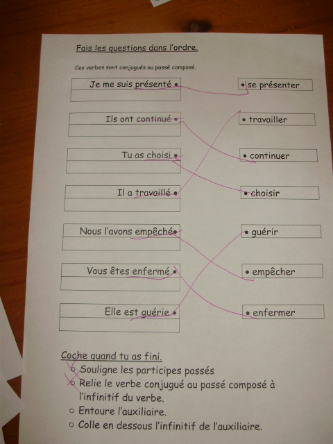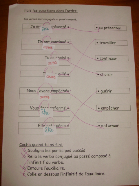 | 4ème étape : il identifie l'auxiliaire utilisé en collant son infinitif. La fiche est terminée. |