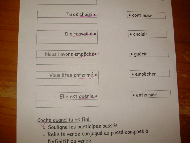 | 1ère étape : l'enfant souligne les participes passés. Il coche lorsqu'il les a tous soulignés. |