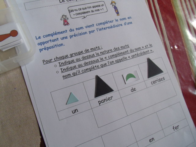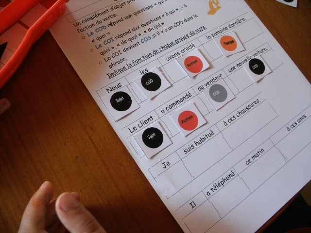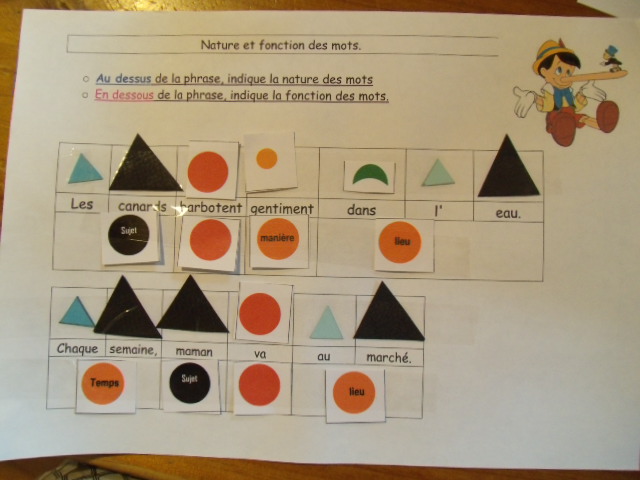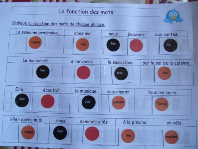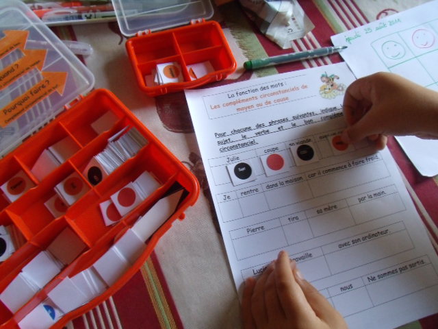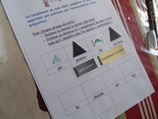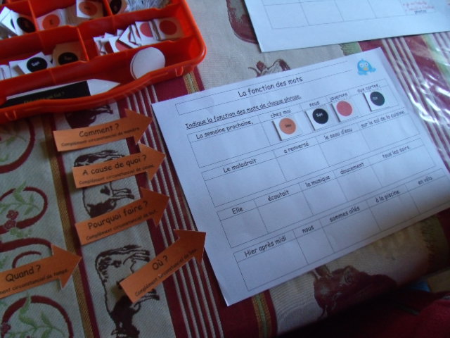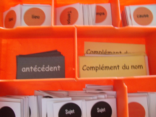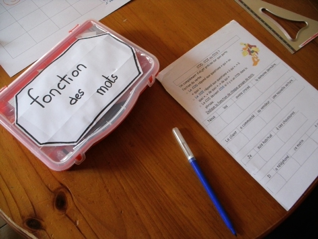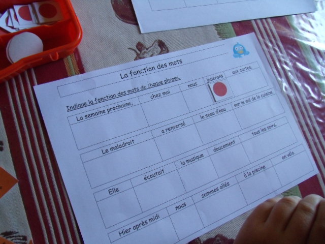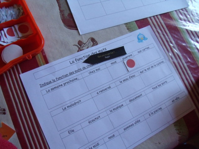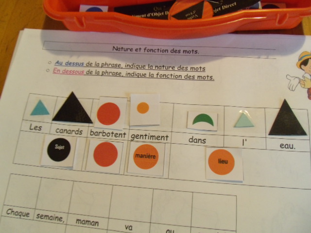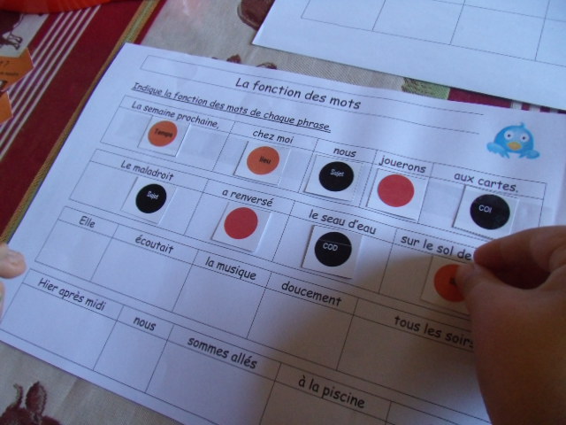 rouge. Comme dans la grammaire montessori, j'indique la fonction des