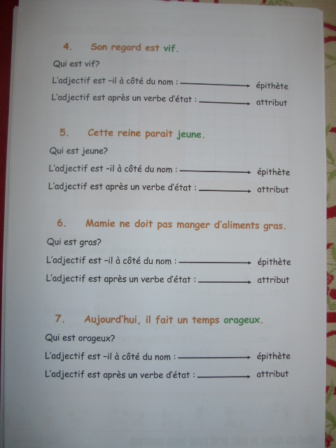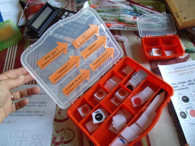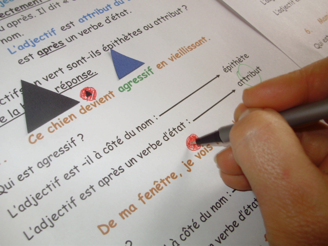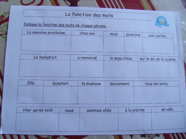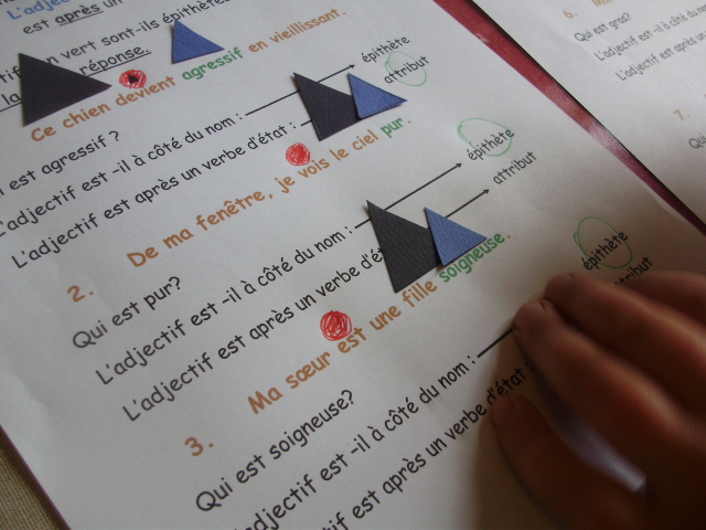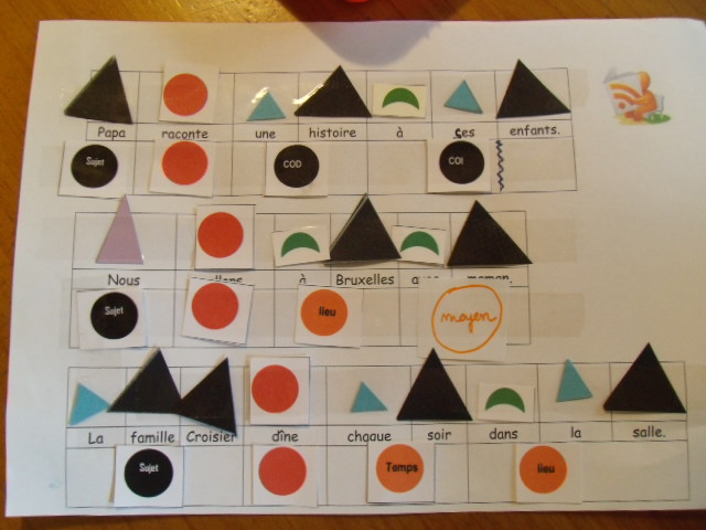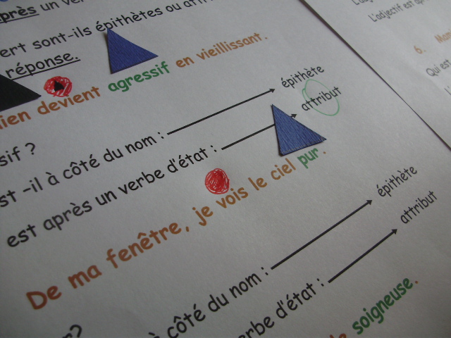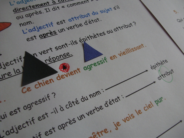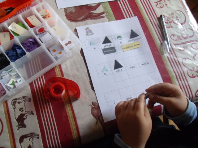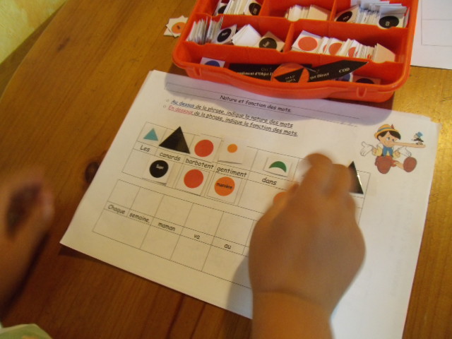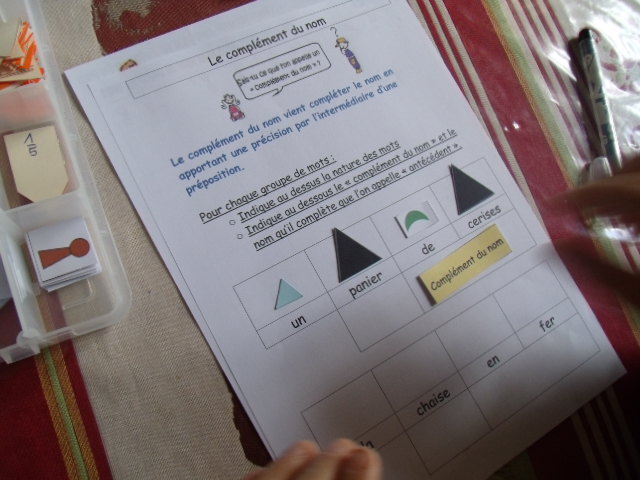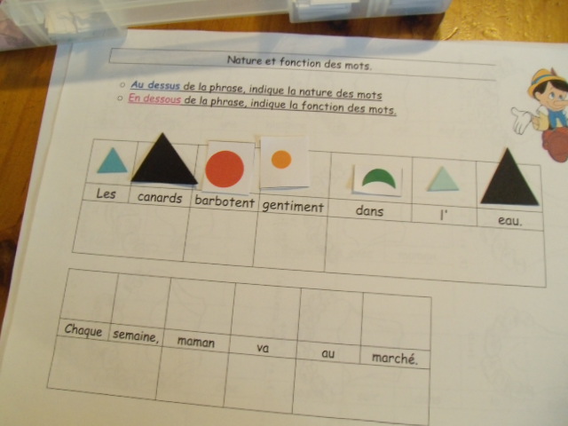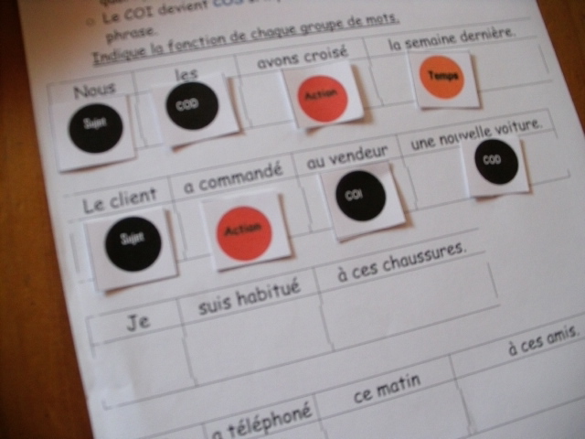 rouge. Comme dans la grammaire montessori, j'indique la fonction des