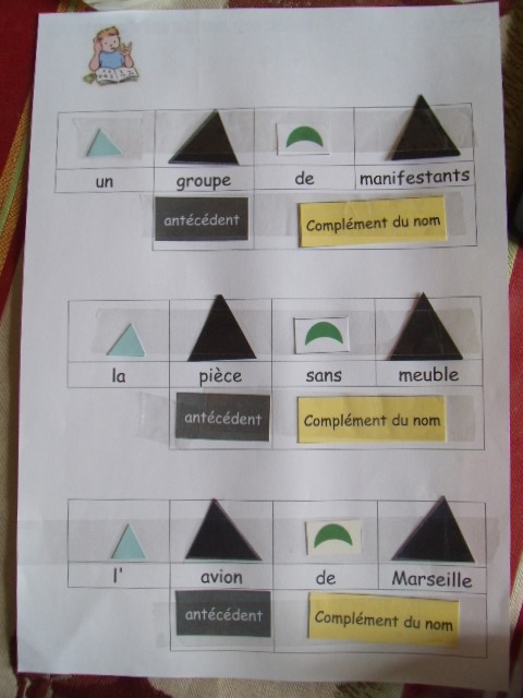 J'ai préparé des petites étiquettes pour indiquer quel est le complément du nom et quel est le nom qui est l'antécédent.