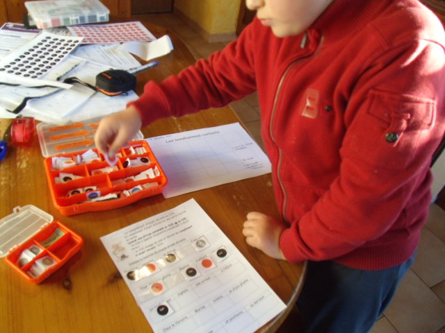 Dans la boite orange, les étiquettes à coller : un rond rouge pour le
