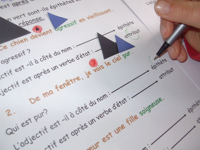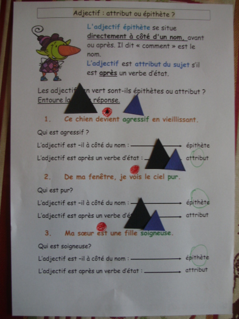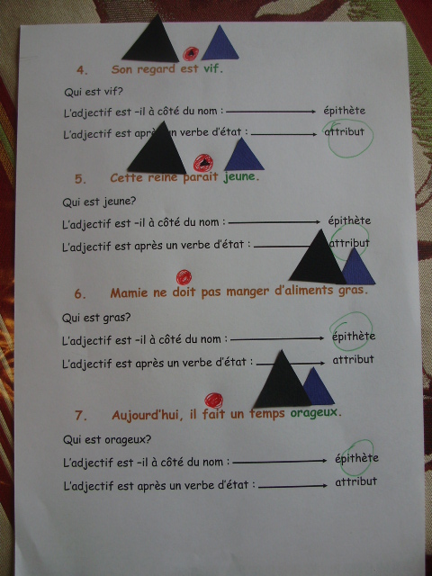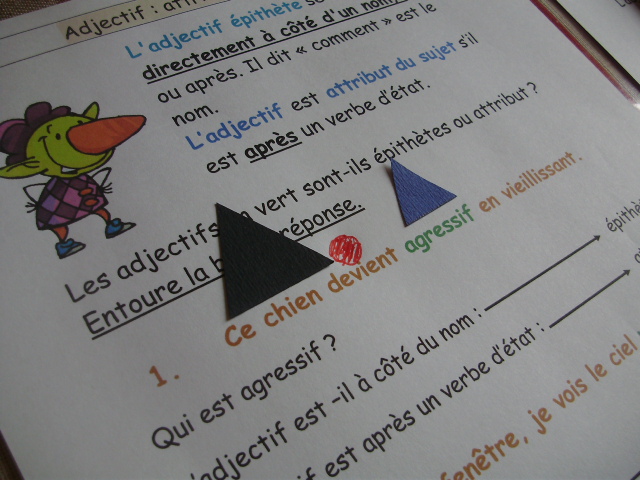 - Le petit roi pose un triangle bleu foncé sur l'adjectif qui nous interesse. Il est facile à reconnaître puisqu'il est en vert.