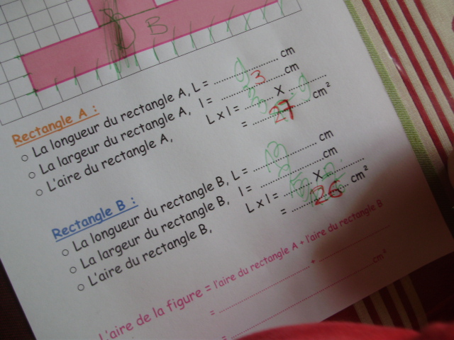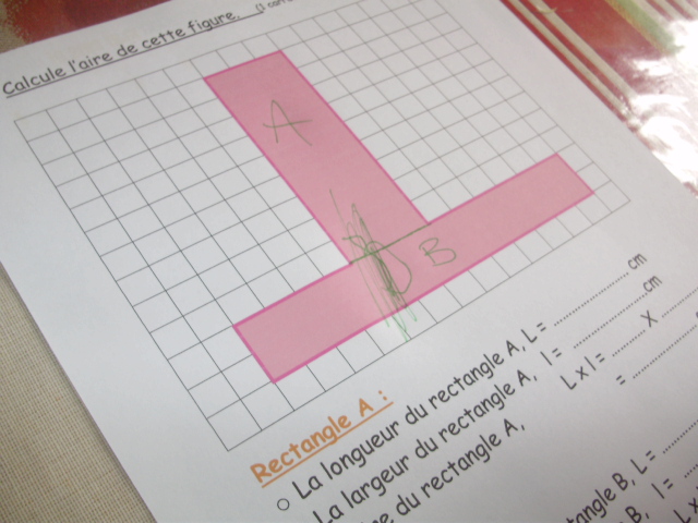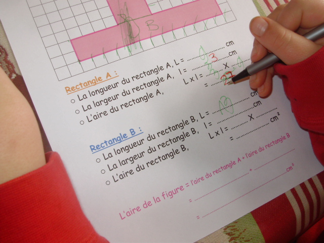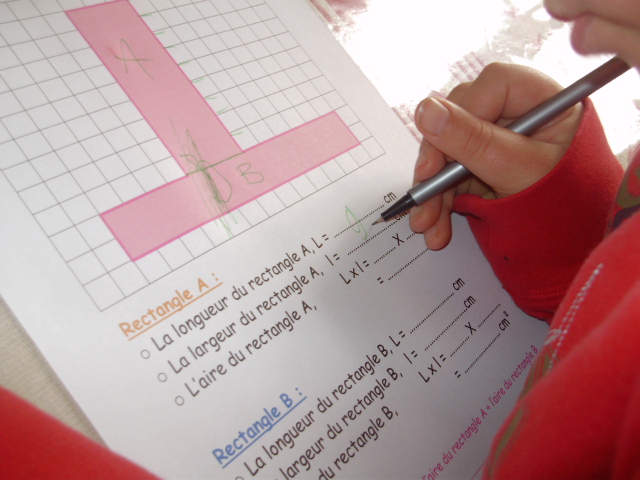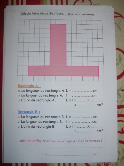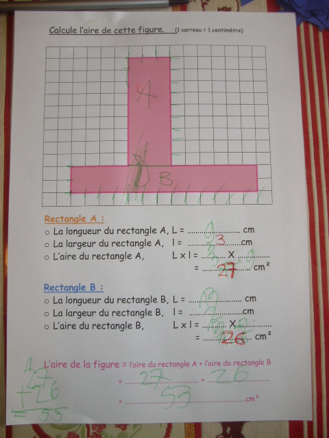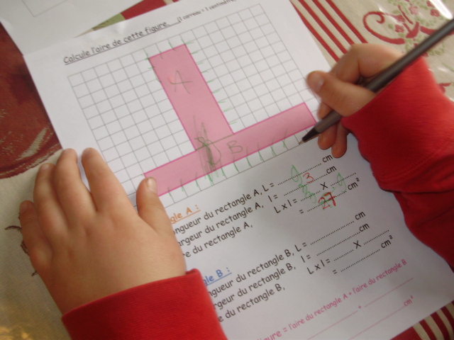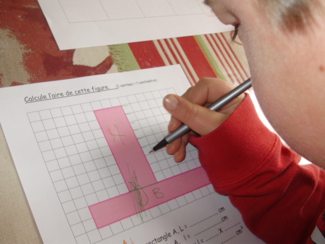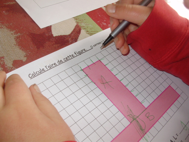L'enfant "sépare" la figure rose en deux rectangles, A et B, dont il va calculer l'aire.