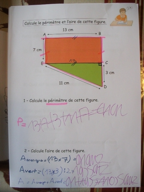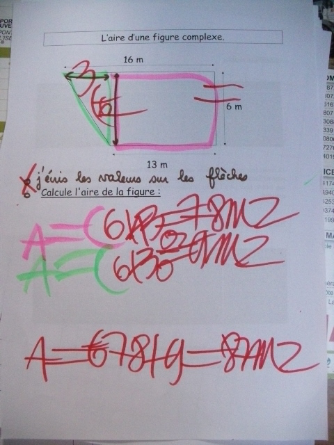 Puis, on calcule l'aire de la figure rose (on écrit A en rose), suivie