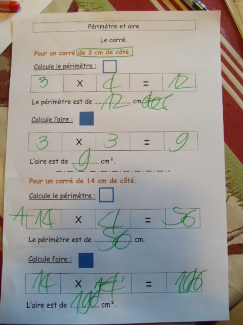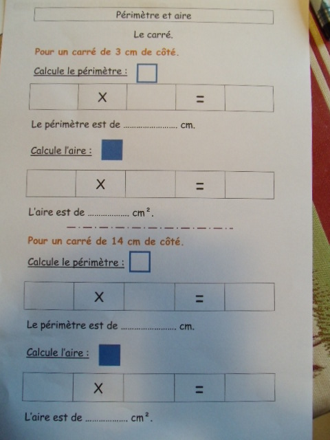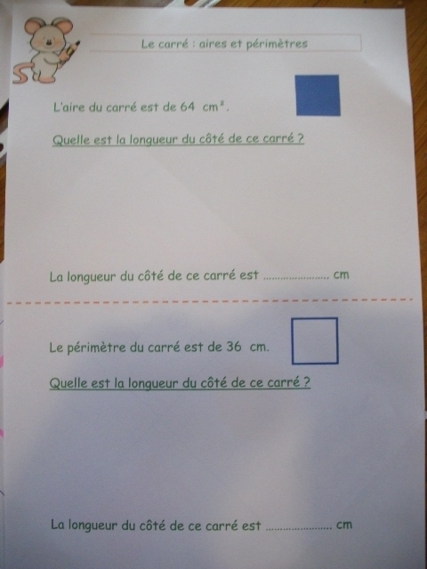 Fiches "l'aire et le périmètre d'un carré"