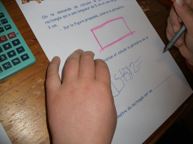 Ensuite, je lui demande de colorier en rose le rectangle et en vert le triangle.