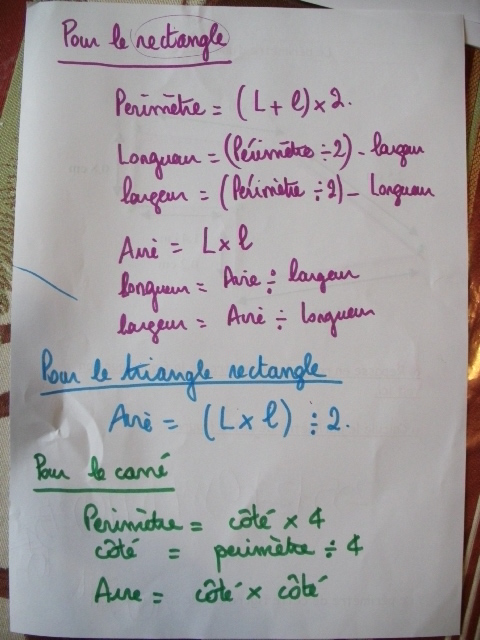 formules aire et périmètre / rectangle, carré et triangle: