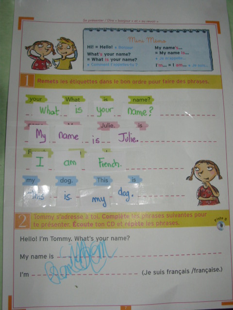 ; tout en ajoutant le vocabulaire pour dire "Je suis" ou "C'est".