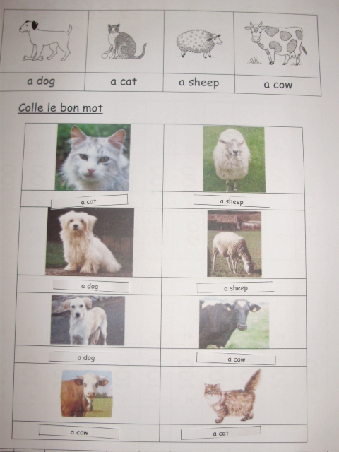 Fiches pour dire "chat, chien, mouton et vache" en anglais