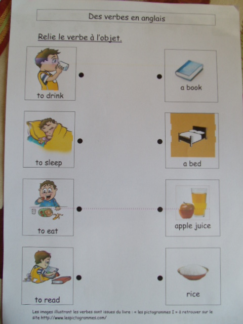 Revoir les verbes "manger" et "boire" et apprendre "dormir" et "lire"