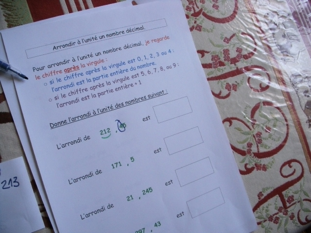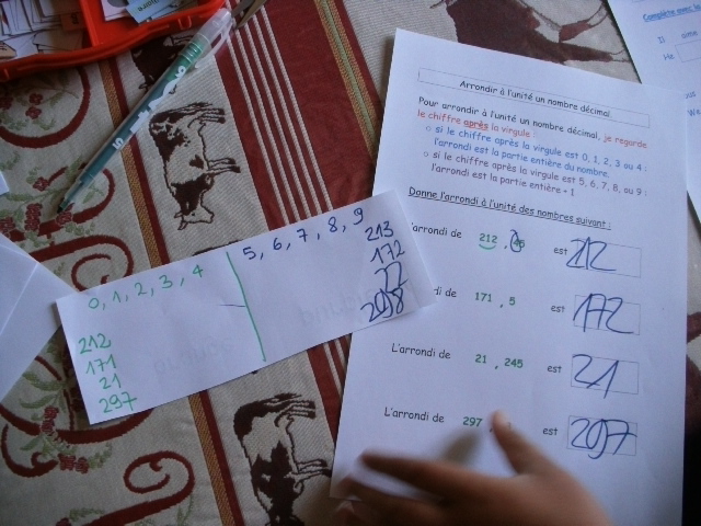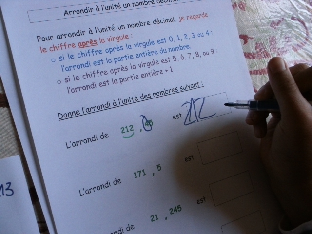 Pour le nombre décimal à arrondir, on regarde la partie entière que l'on écrit à gauche de la petite feuille. |