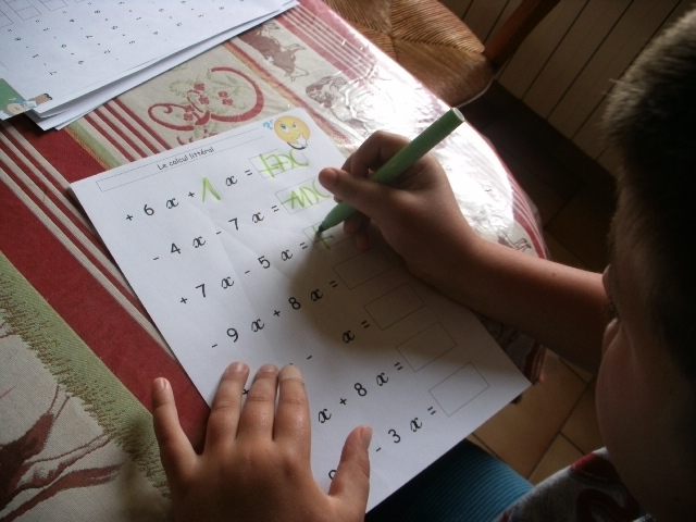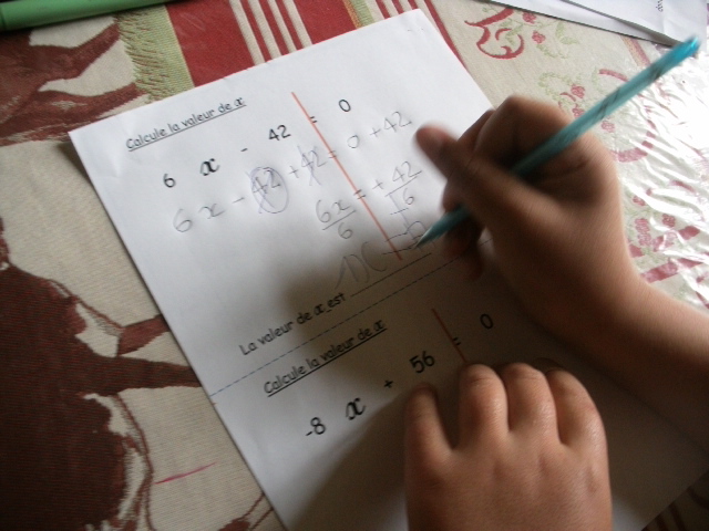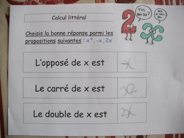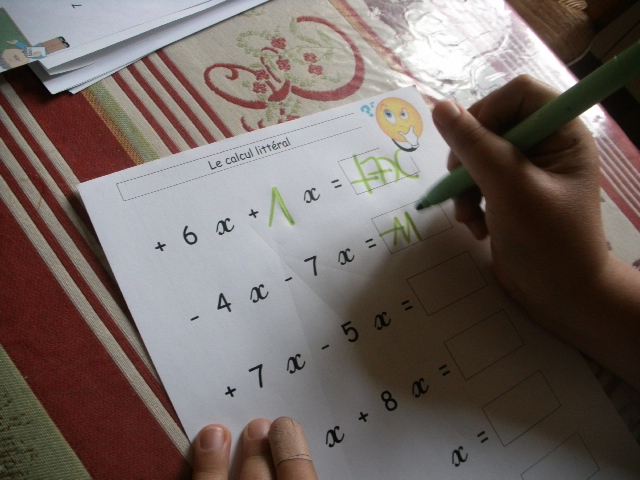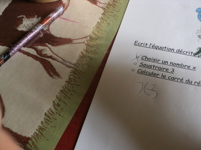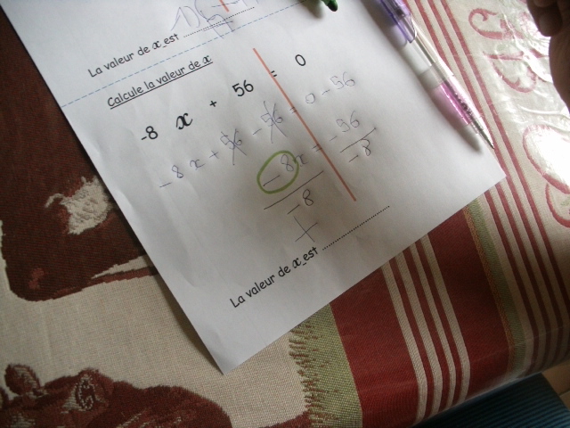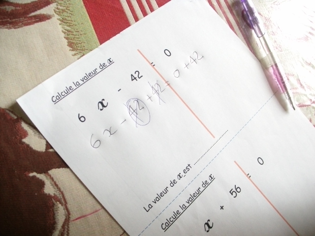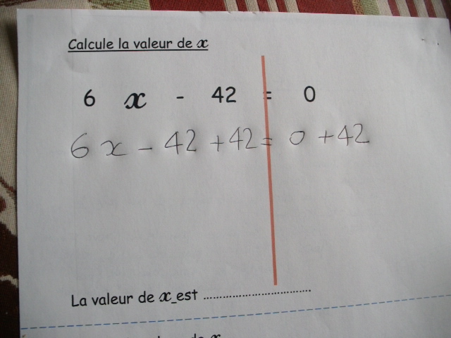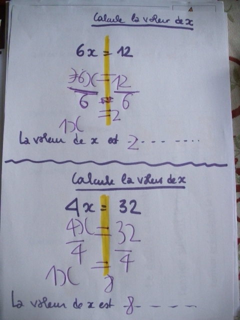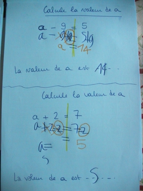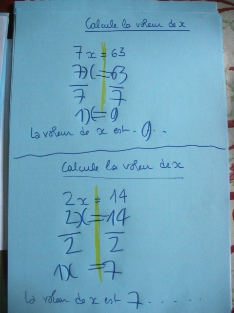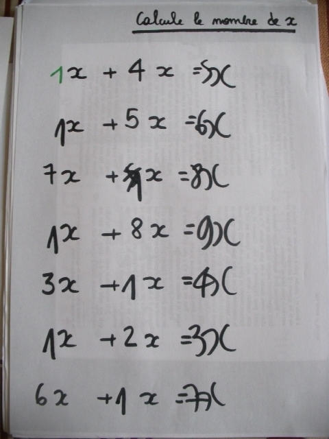 Dans cette série de fiches, je demande à l'enfant de remplacer "x" par une valeur que je lui ai proposée.
