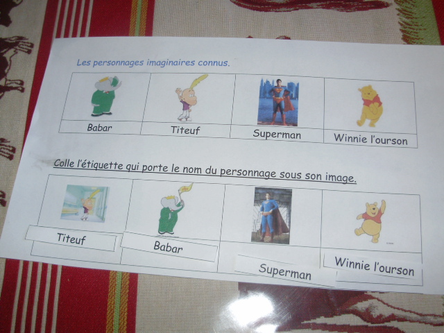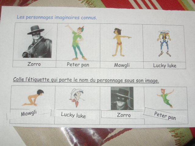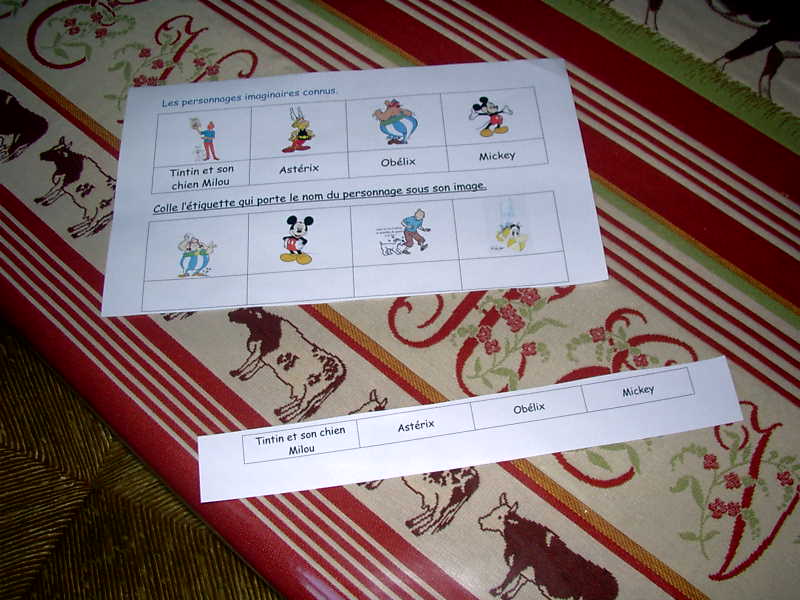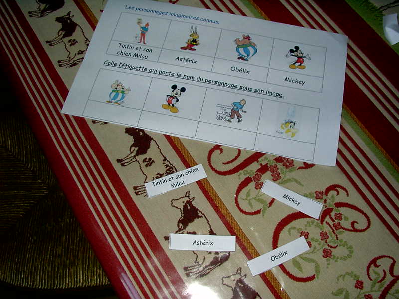 L'autre jour, le petit roi portait un très joli T-shirt (récupéré auprès d'une amie) sur lequel il y a un dessin de Tintin et Milou. Lorsque nous sommes arrivés chez le boucher, il a demandé à notre fils qui était le personnage dessiné sur son T-shirt. Il l'a regardé étonné et il a dit "un garçon". Je me suis alors dit qu'il était indispensable qu'il connaisse un certain nombre de personnages imaginaires qui font partis de la culture commune. Ceci explique la réalisation des fiches que je vous propose ci-dessous.