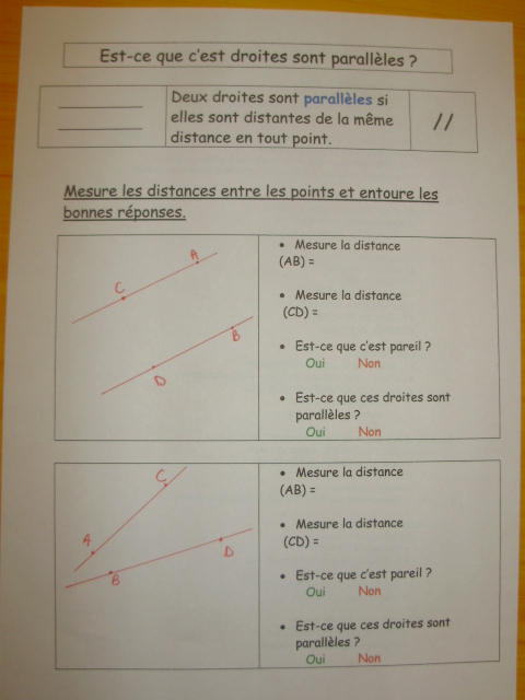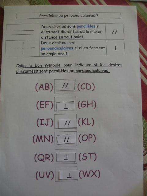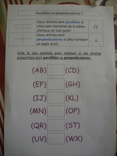 Je lui ai proposé des fiches pour aborder deux notions complémentaires : les droites perpendiculaires et les droites parallèles. fiches sur les droites perpendiculairesau format wordau format pdfPour