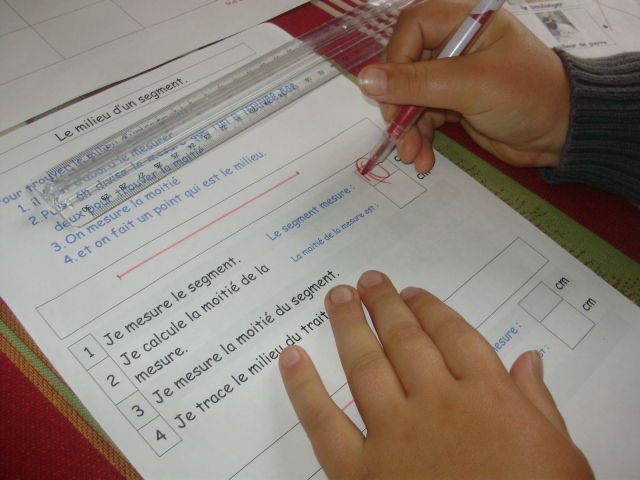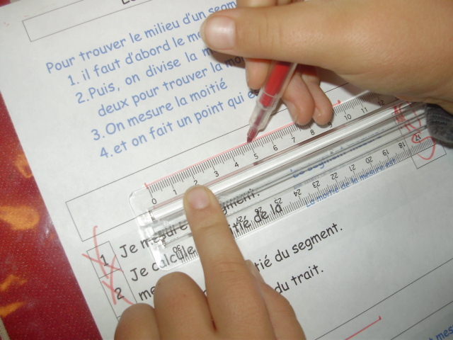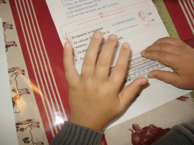 L'enfant mesure la moitié avec la règle et fait un petit repère sur le segment.