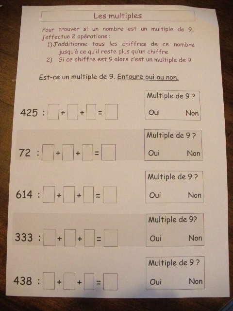 Je suis en train de travailler les multiples et diviseurs je vous joint la fiche que j'ai faite pour les multiples de 9