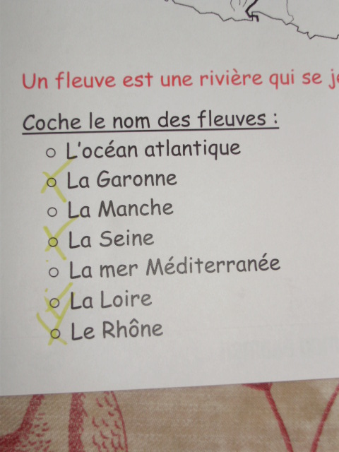 L'enfant doit uniquement cocher le nom des fleuves parmis une liste de