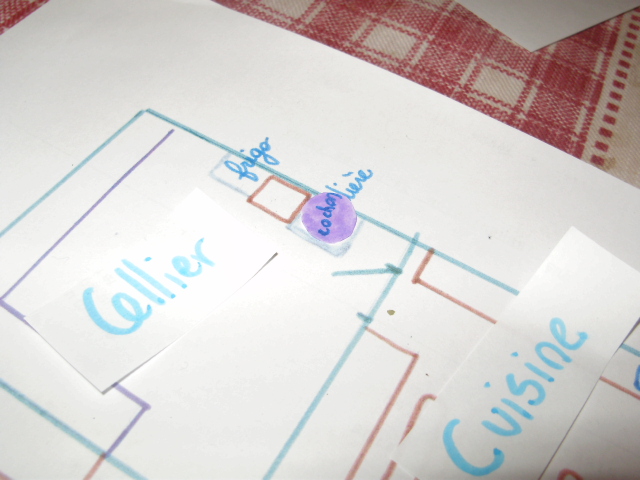 | L'enfant positionne les étiquettes qui ne sont pas préencollées pour pouvoir les déplacer en cas d'erreur. | Une fois toutes les étiquettes bien placées, je les fixe avec du scotch. |