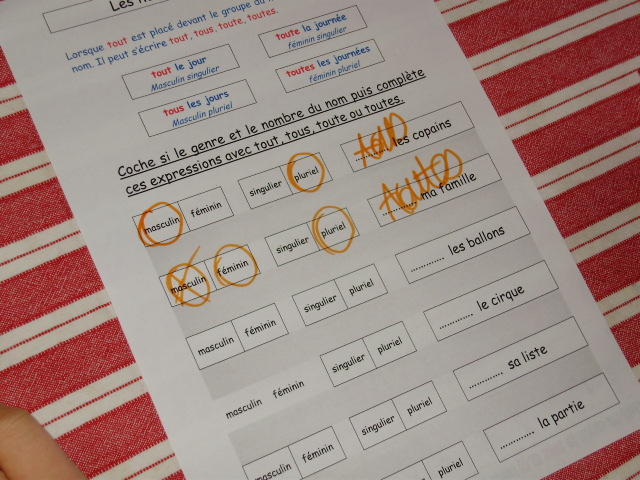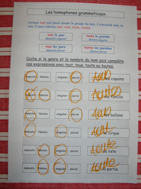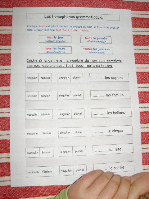 J'ai créé une série de fiches sur lesquelles je présente tout d'abord la règle. Puis, pour chaque groupe nominal proposé, je demande à l'enfant d'identifier d'abord son genre et le nombre; à partir de là, en regardant la règle du début de page, il peut trouver s'il faut écrire tout, tous, toute ou toutes.Fiches sur "tous, tout, toute, toutes"