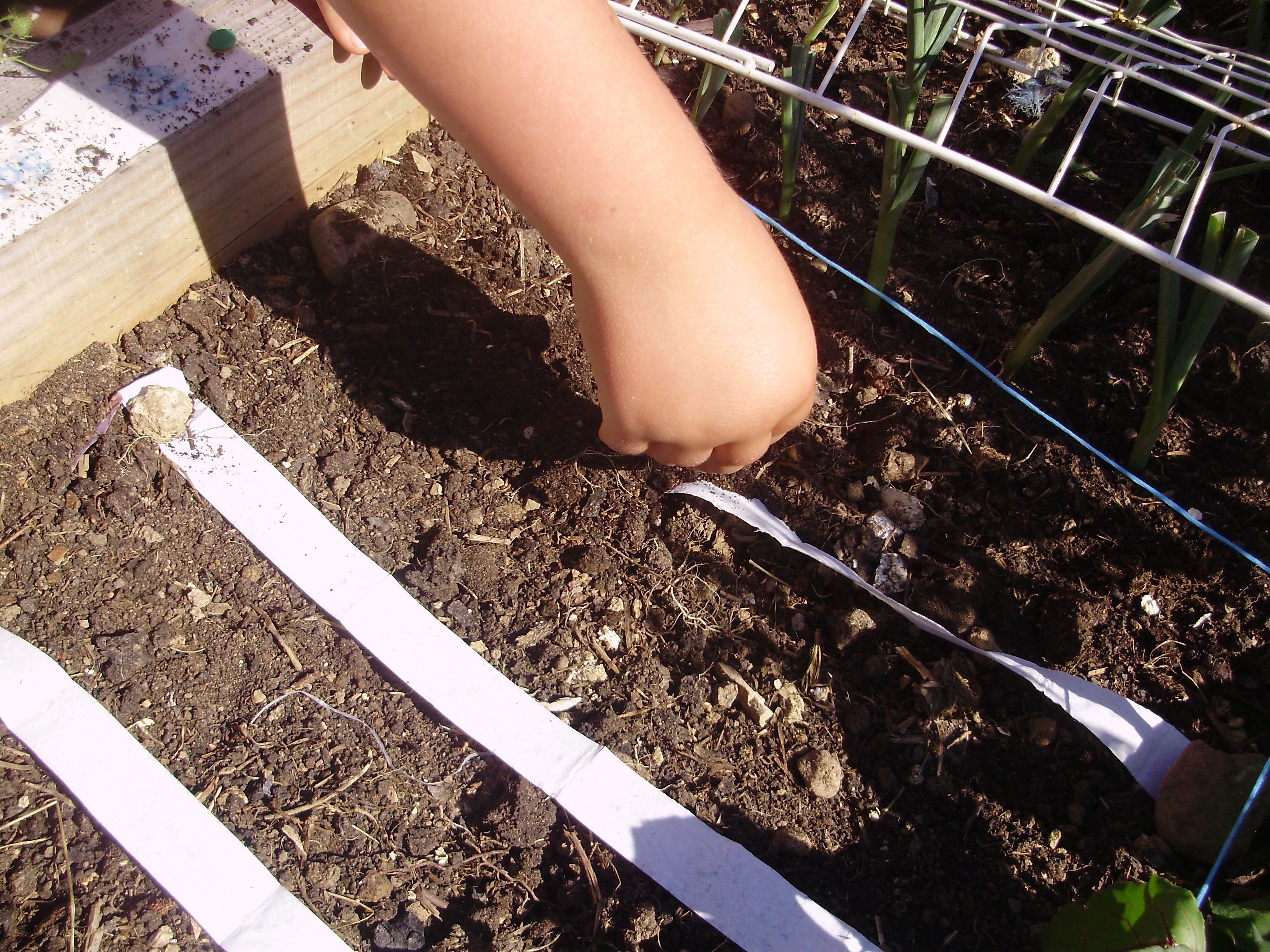 |  On fait le trou avec le plantoir, puis on glisse le poireau dans le trou.