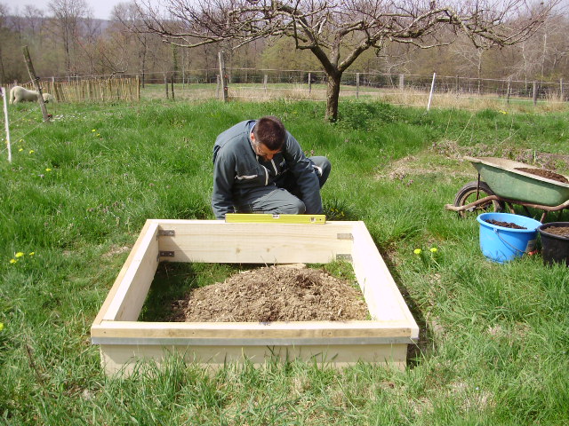 portée de vue et proche d'un point d'eau.Puis, j'ai poursuivi la recherche de terre de bonne qualité pour remplir le cadre. Je suis, dans un premier temps, allée en chercher dans le bois qui est à proximité de notre domicile. Mais