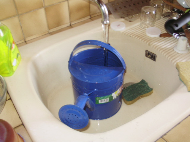Il remplit le petit trou d'eau. Pour faciliter le travail, on a enlevé la pomme de l'arrosoir qui se dévisse.