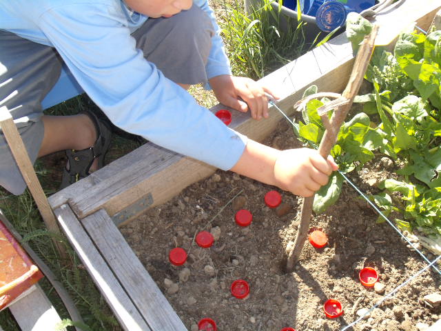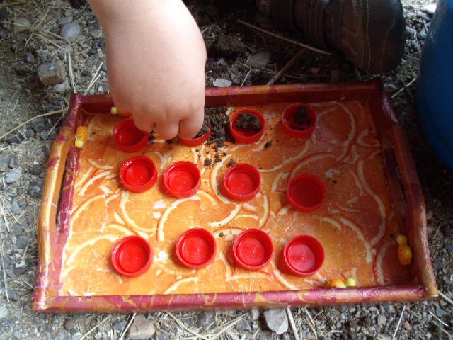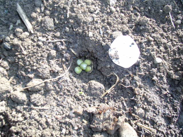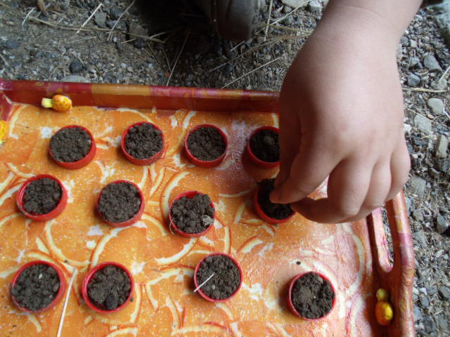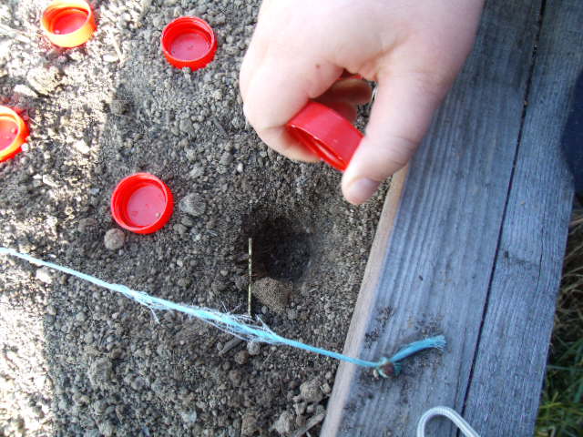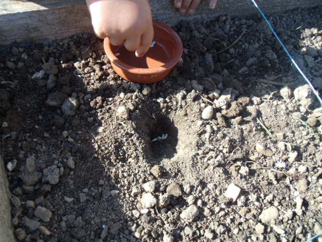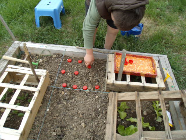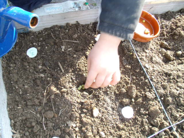 Il dispose de 5 graines de petits pois dans le trou.