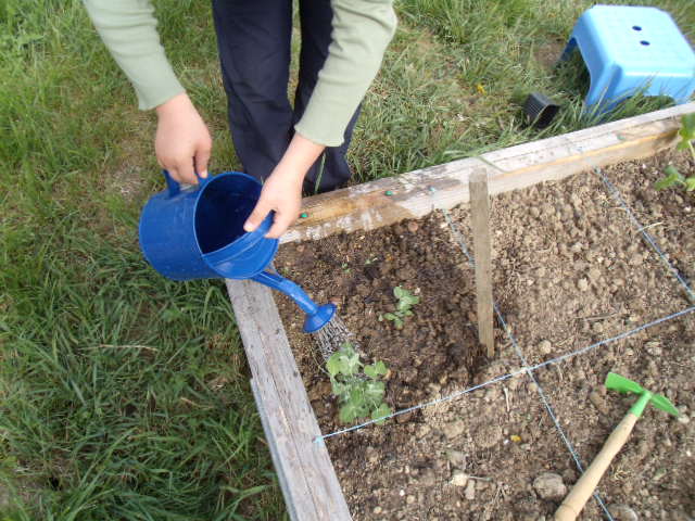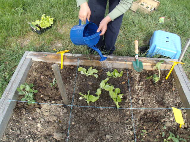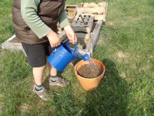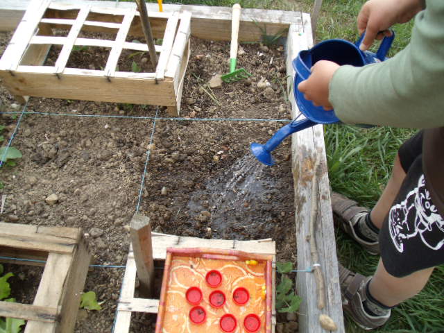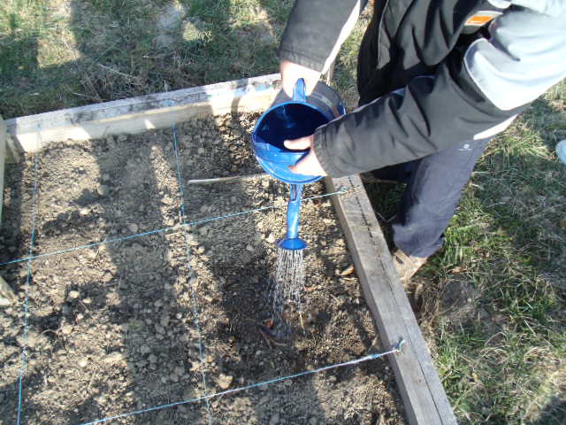 arrosage de tous les carrés et des trois pots.