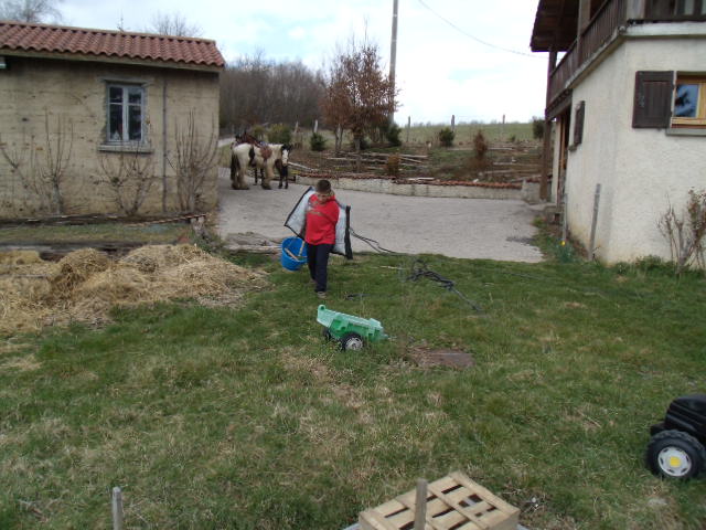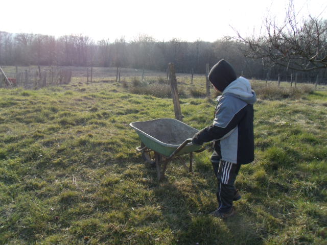 Le petit roi amène la brouette, son papa la remplit et je me charge de la ramener jusqu'au jardin.