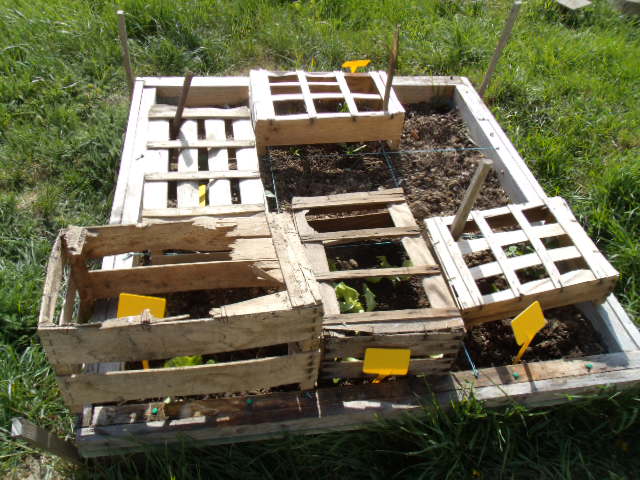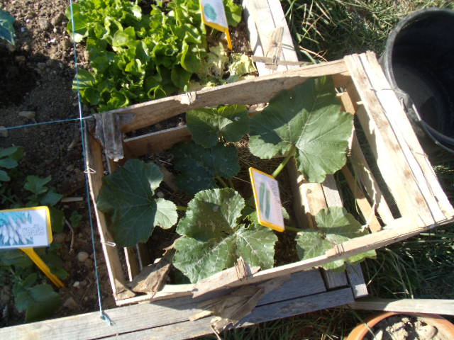 J'ai décidé de laisser le pied de courgette encadré par un cageot pour