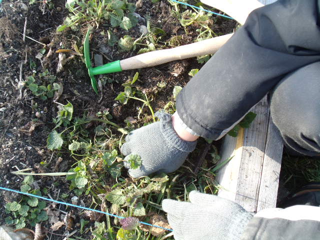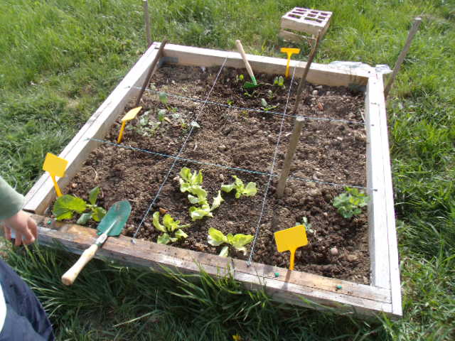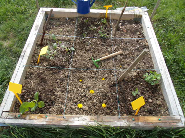 On est allé chercher le tabouret. Il s'agit ici de retirer l'herbe d'un des carrés.