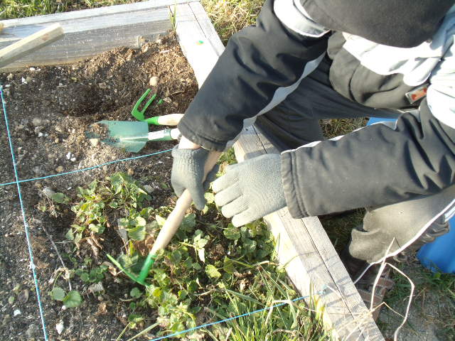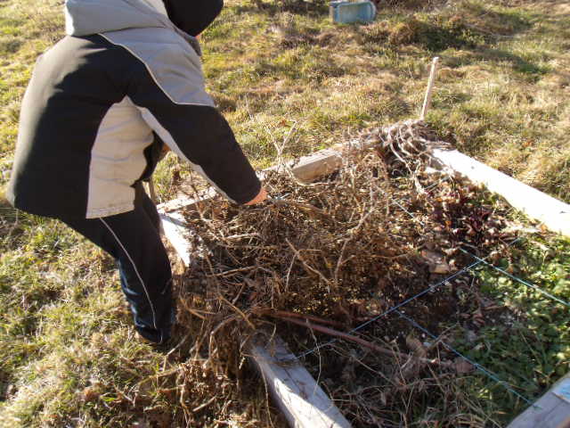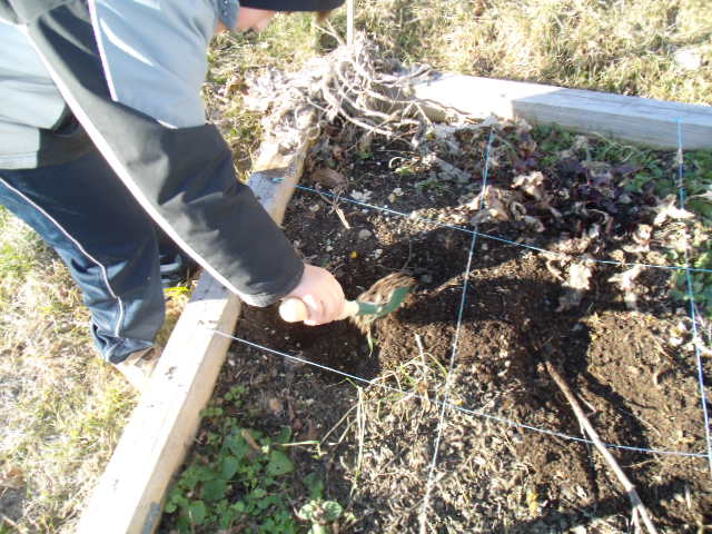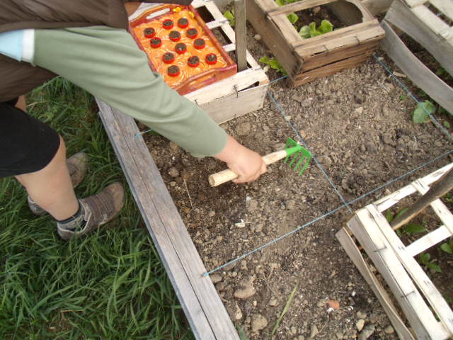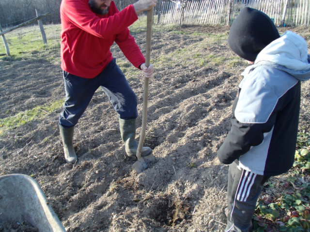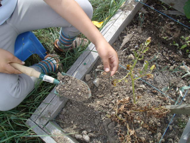Notre fils utilise sa pelle pour détérer le pied de tomate qui lui résiste.