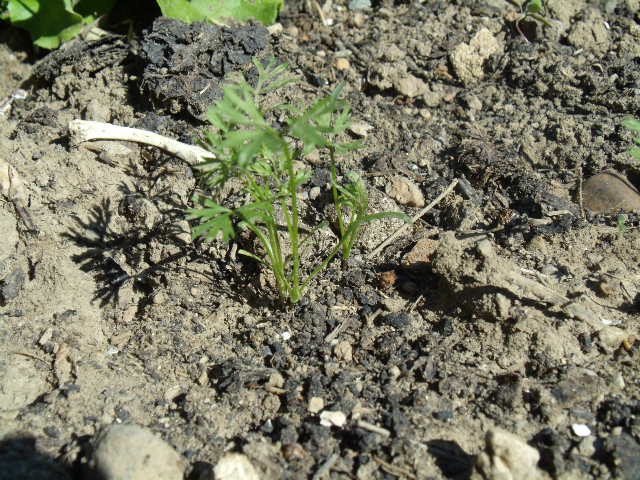 Les carottes pointent leur nez. Seuls 8 graines sur les 12 plantées ont