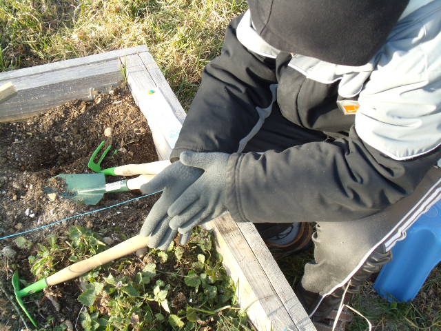 La dernière fois, notre fils était gêné par la présence de terre sur ses mains. Je lui ai donc proposé de mettre des gants.