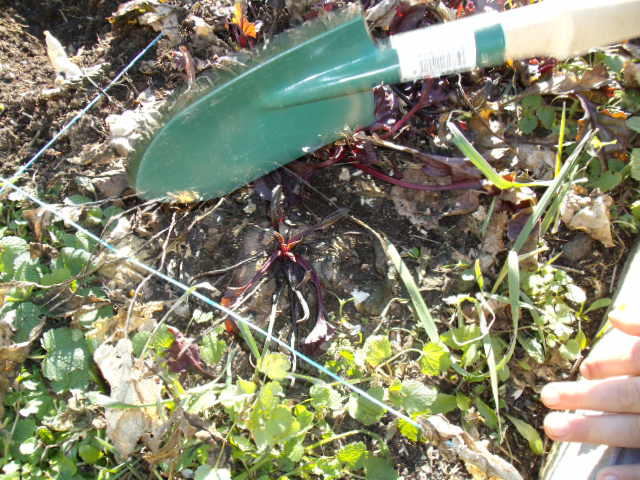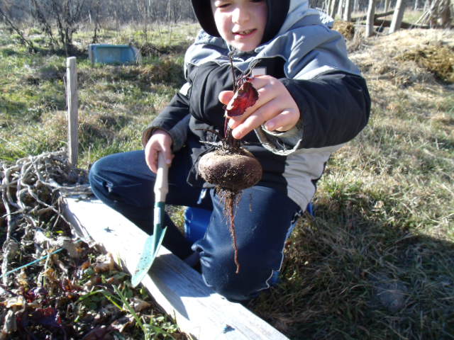 Surprise : le petit roi trouve une betterave rouge que nous n'avions pas pris le temps de récolter.