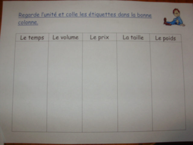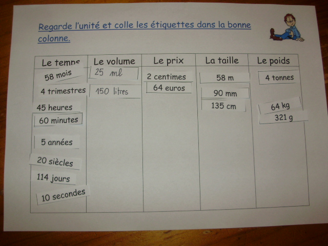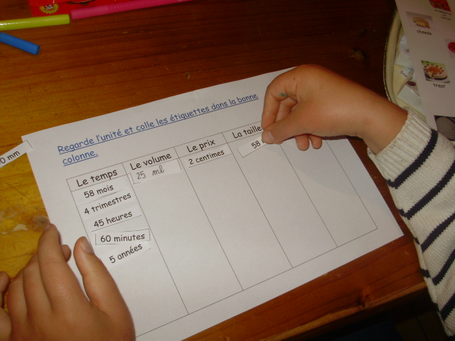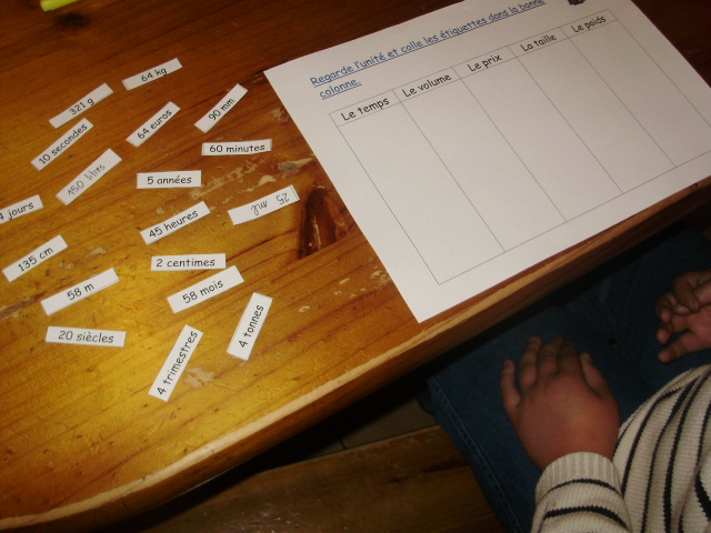 On poursuit l'exercice un peu différemment. Je donne un tableau au petit roi avec différentes mesures que l'on peut effectuer et une série d'étiquettes avec des données chiffrées. Je lui demande de placer chaque étiquette dans la bonne colonne en tenant compte de l'unité.