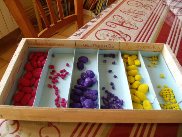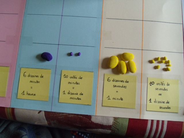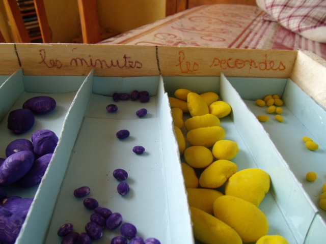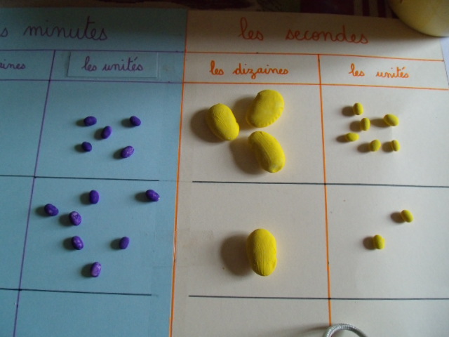 On met autant de graines que le chiffre l'indique : ici, on a 6 unités de secondes, 3 dizaines de secondes....