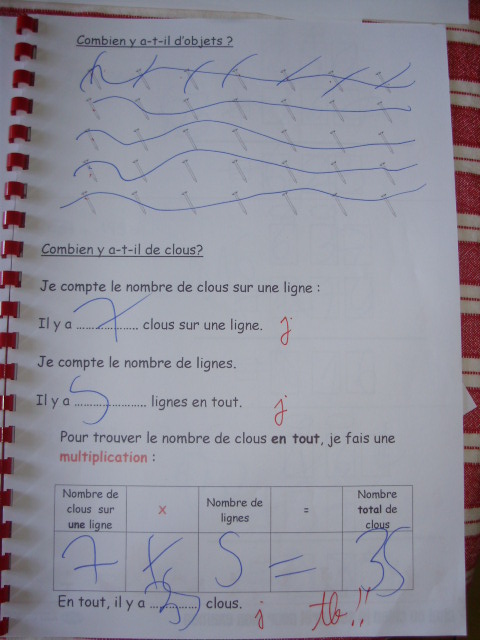 qu'il les compte.Puis seulement, je lui ai proposé de dénombrer les cases d'un tableau grâce à la multiplication.