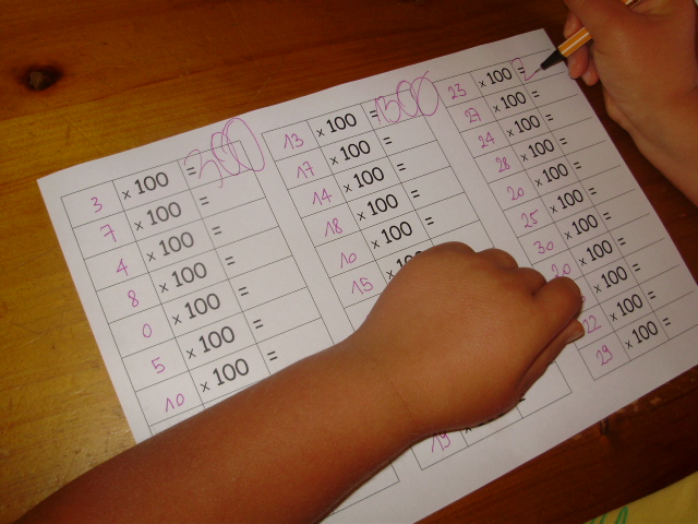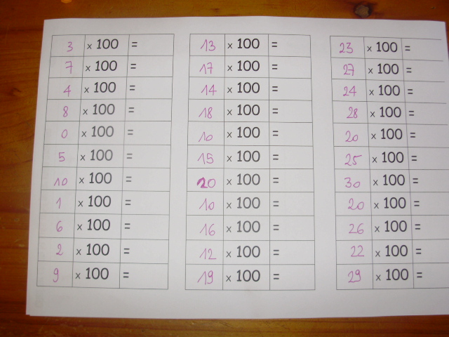J'ai procédé de la même façon que pour apprendre à multilplier par 10, hormis que l'on ajoute les deux zéro du 100.