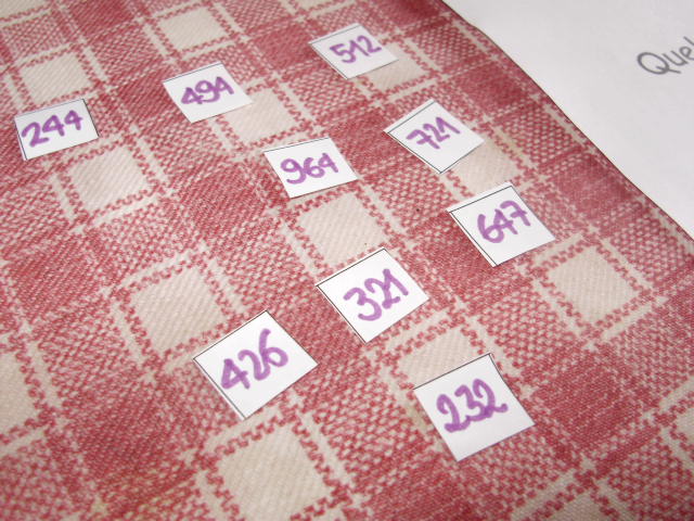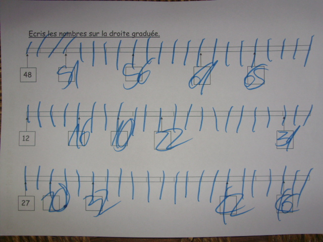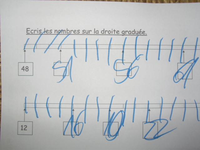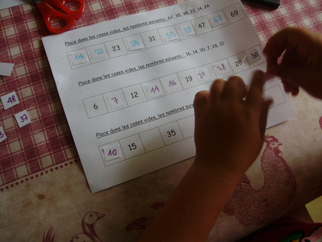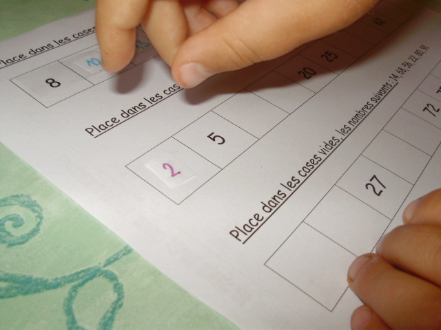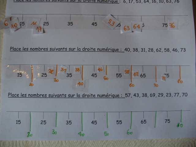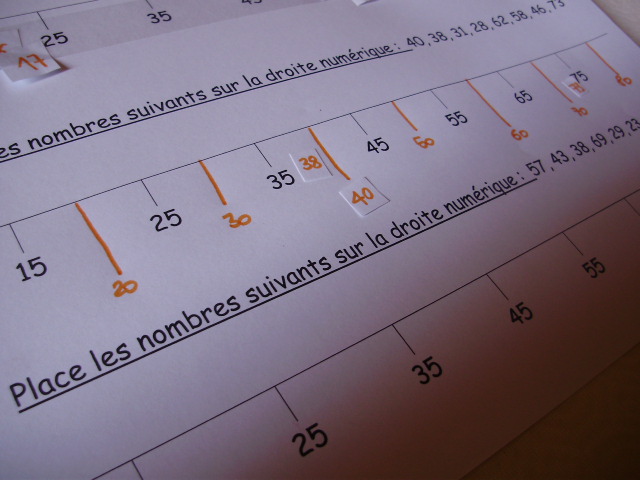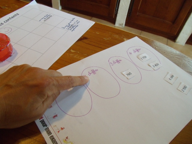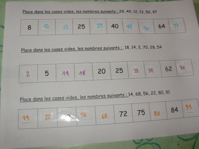 | Les nombres à positionner sont indiqués sur la fiche, mais pour faciliter le travail du petit roi, je les ai reproduit sur des petits morceaux de papier ; cela lui permet de les déplacer si il se trompe. | Pour faciliter la compréhension, j'écris les nombres à positionner sur les différentes lignes de couleurs différentes. |