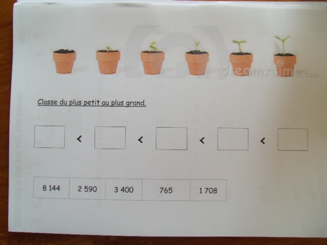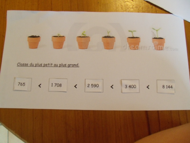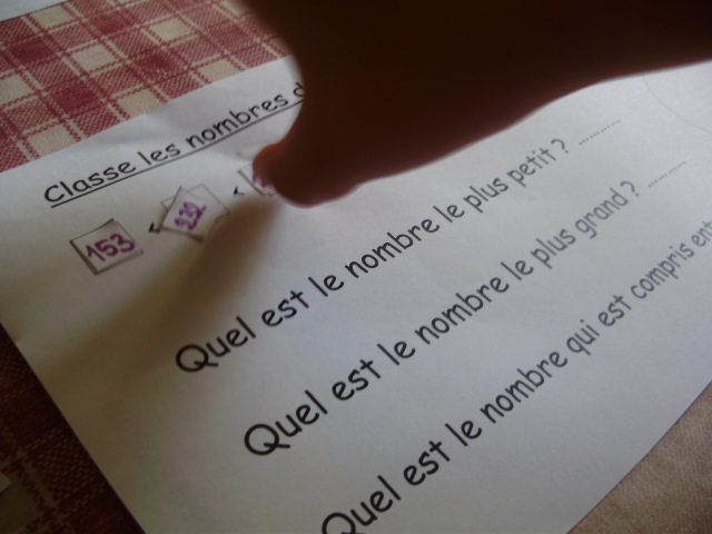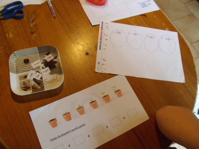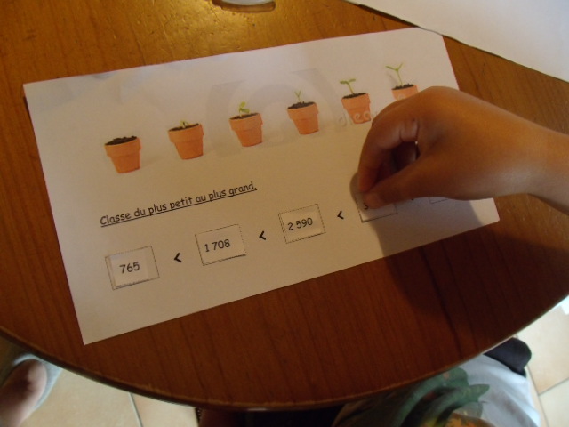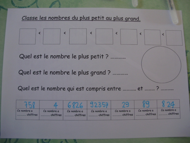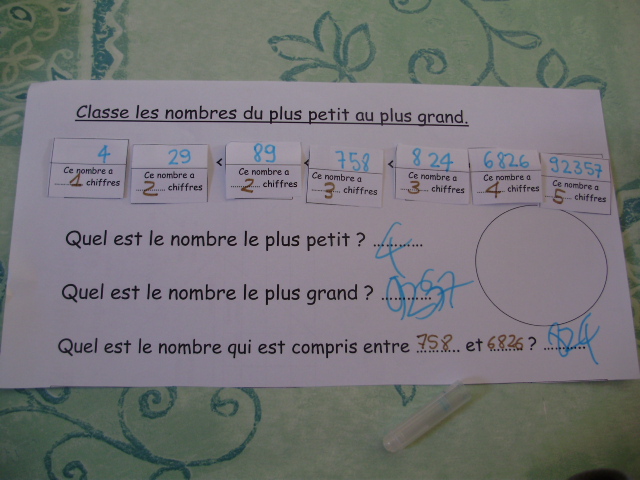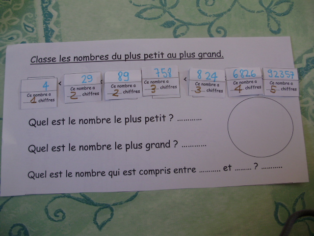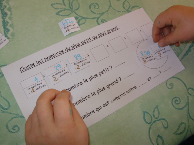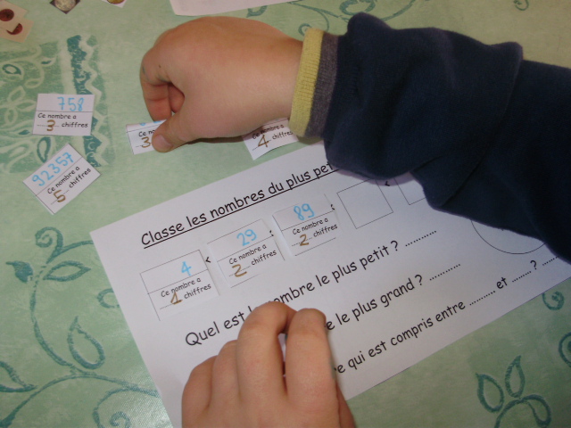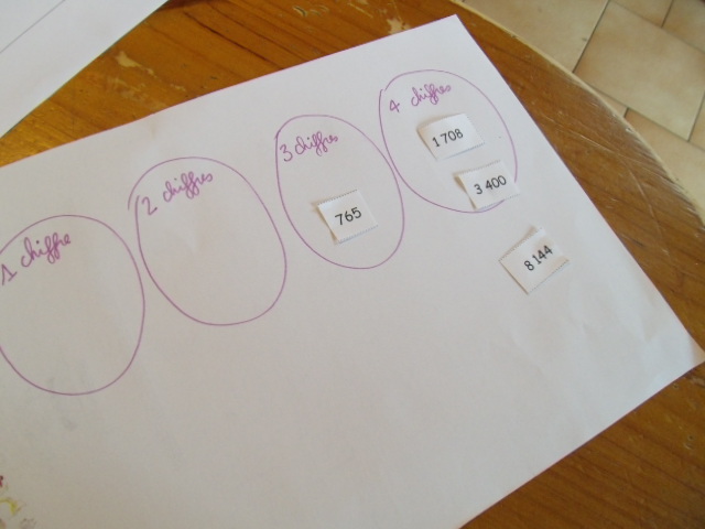 je propose à notre fils de classer tout d'abord les nombres en fonction du nombre de chiffres qu'ils contiennent. |
