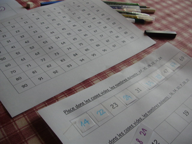 | Pour l'aider, dans un premier temps, je lui ai proposé un tableau des nombres de 0 à 99, mais il s'en est très peu servi. | Je colle chaque nombre avec du scotch une fois que l'enfant l'a posé au bon endroit. |