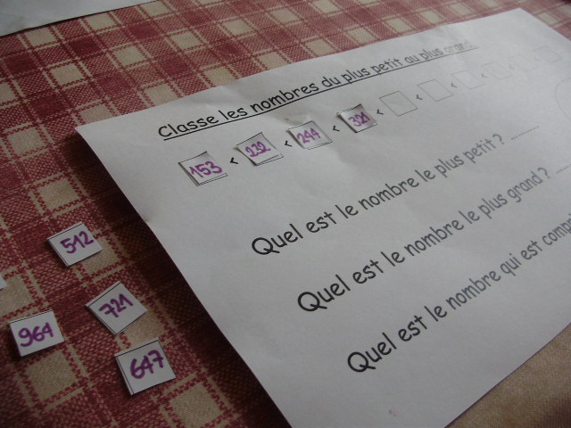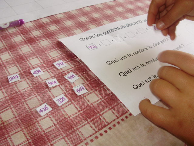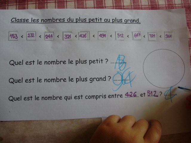 | Puis, on repart sur le classement des centaines en cherchant le ou les nombre(s) qui a(ont) trois centaines. | Lorsque tous les nombres sont classés; l'enfant doit inscrire le nombre le plus petit, le plus grand et celui qui est compris entre les deux nombres que j'ai indiqué sur la fiche. |