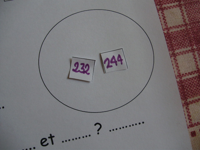 | Il y a deux nombres qui ont deux centaines. On les positionne donc dans le rond. On regarde alors les dizaines : il y a le 3 et le 4. | Puis, on compte pour classer sur les dizaines : 0, 1, 2, 3 (on positionne le 232), 4 (on positionne le 244). |