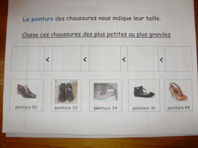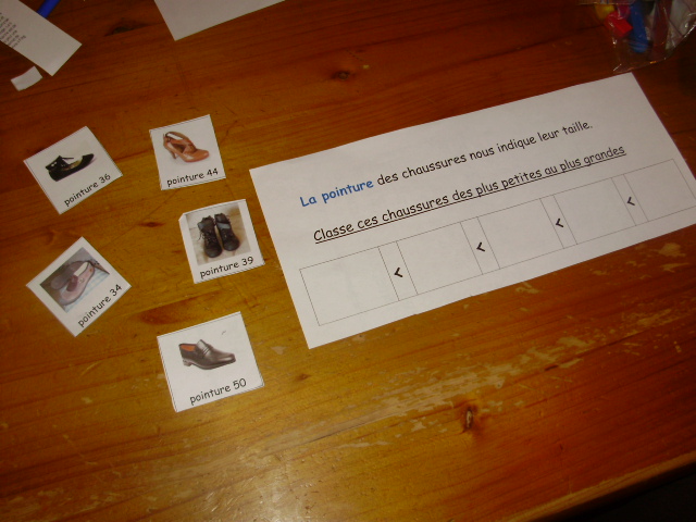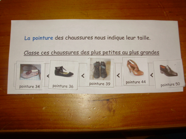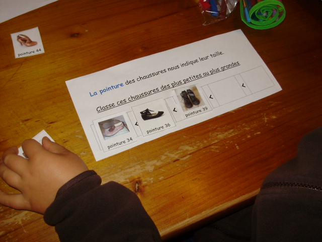 | L'enfant place alors les étiquettes présentant des chaussures de pointures différentes dans les cases support. | Et voilà la fiche terminée. |