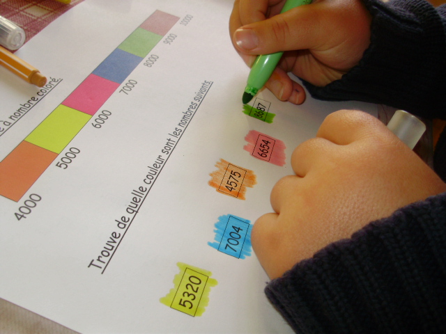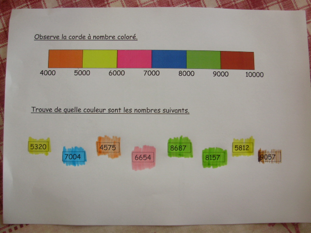 | Une "corde" est colorée avec des tronçons de couleurs différentes. La couleur change tous les 1000. En dessous, se trouvent des étiquettes avec des nombres à 4 chiffres. L'enfant doit choisir la couleur avec laquelle il va colorier l'étiquette en référence à la position du nombre sur la "corde" dessinée au dessus. | |